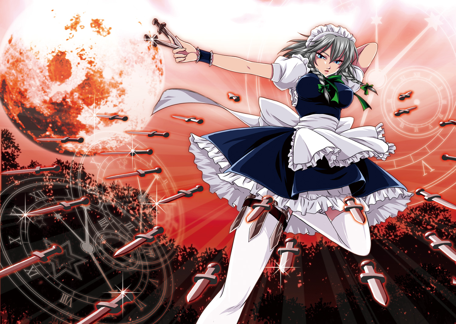 1girlblue eyesbraidclockdanmakufemale focusknifemaid headdressmoonred moonroman numeralshort hairsolothighhighsthrowing knifetwin braidsweaponwrist cuffs