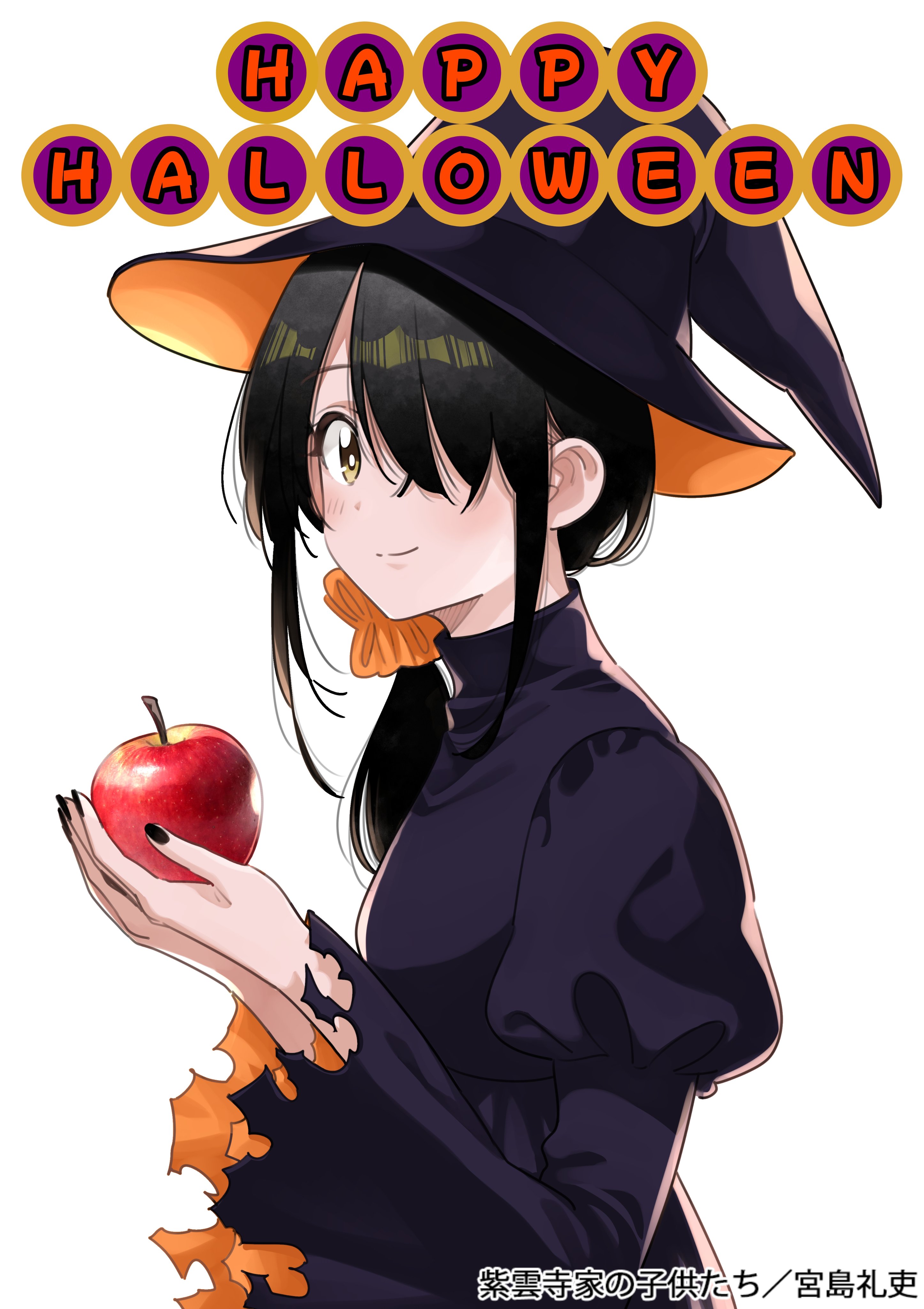 1girlappleartist nameblack dressblack hairblack hatblack nailsclosed mouthcopyright namecowboy shotdressfoodfruithair ornamenthair over one eyehair over shoulderhair scrunchiehalloweenhalloween costumehappy halloweenhatholdingholding foodholding fruitjuliet sleeveslong hairlong sleeveslooking at viewernail polishone eye coveredorange scrunchieponytailpuffy sleevesscrunchiesidelockssimple backgroundsmilesolotorn clothestorn sleevestwo-sided fabrictwo-sided headwearwhite backgroundwitchwitch hatyellow eyes
