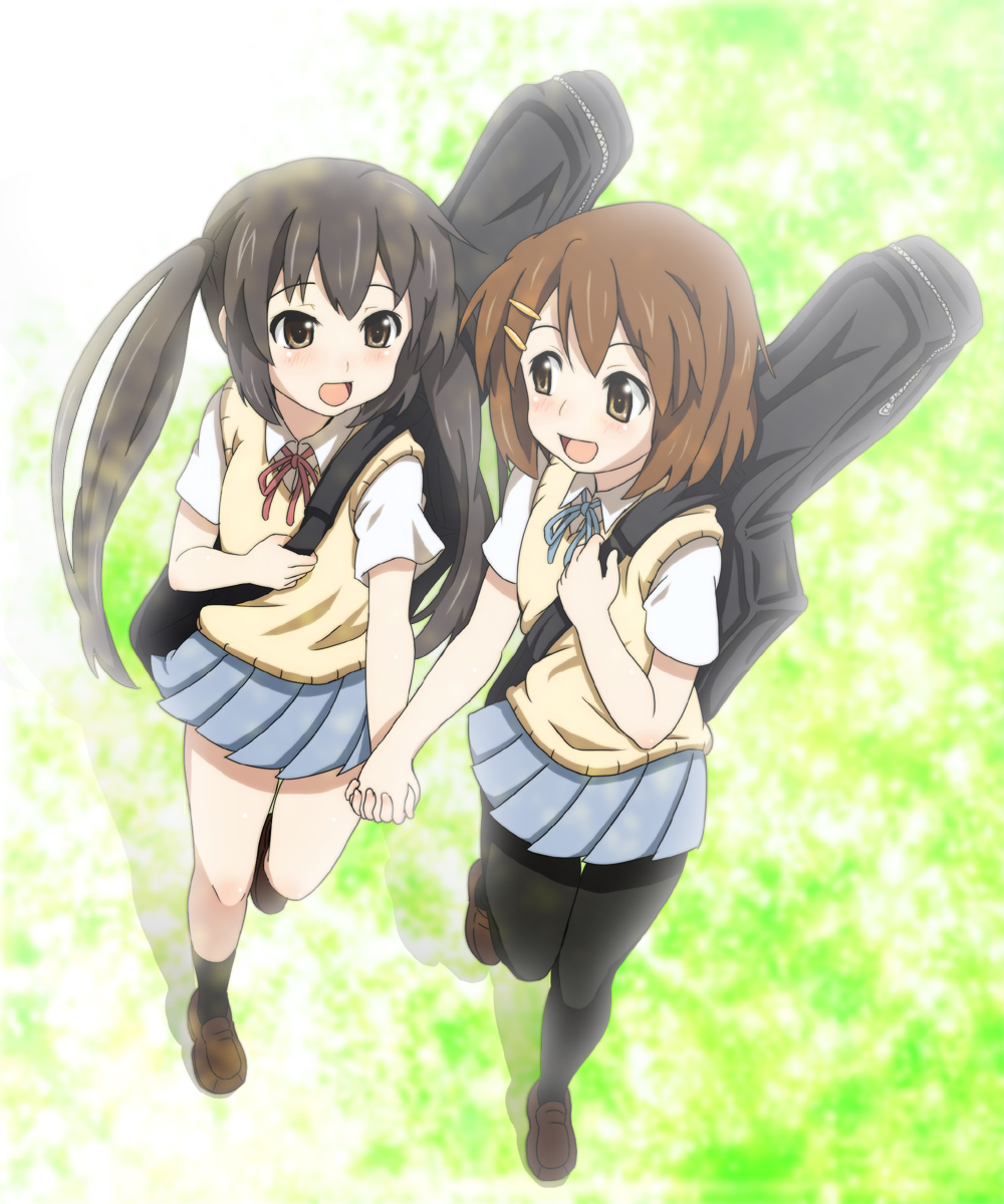 00s2girlsblack hairbrown eyesbrown hairguitar caseholding handsinstrument caselong hairmultiple girlspantyhoseschool uniformshort hairsweater vesttwintails