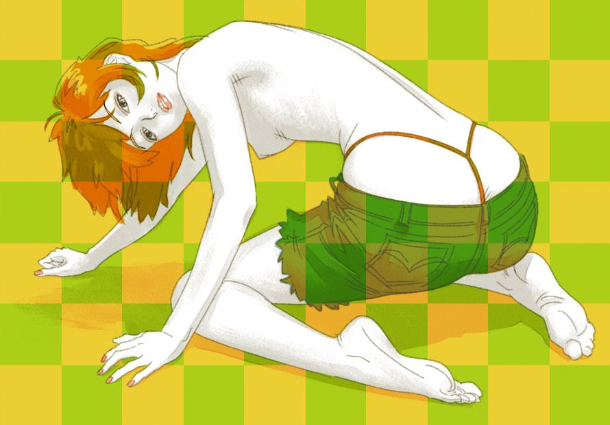 1girlassbarefootfeetfemale focuskneelinglooking at viewerlooking backorange hairpantiesshortssolothongtopless femaleunderwear
