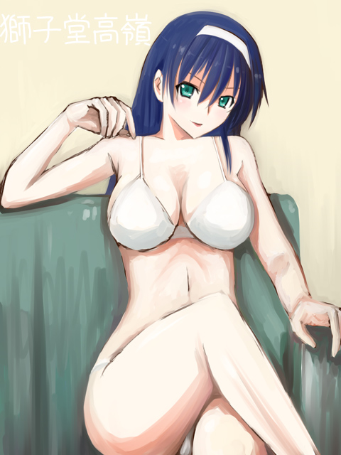 00sbikiniblue hairblushbreastscrossed legsgreen eyeshairbandlarge breastslong hairsittingsoloswimsuitwhite bikini