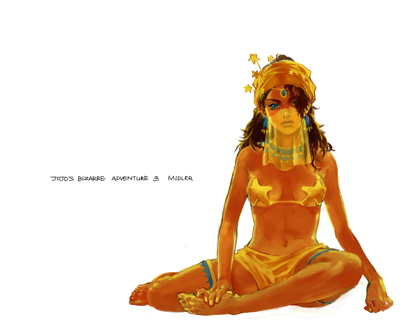 1girlarabian clothesbandanabare shouldersbarefootblue eyesbrown hairdancerdark skindark-skinned femaleearringsfemale focusfull bodygypsyjewelrylong hairmidriffnavelnecklacesimple backgroundsittingsolostar (symbol)veil