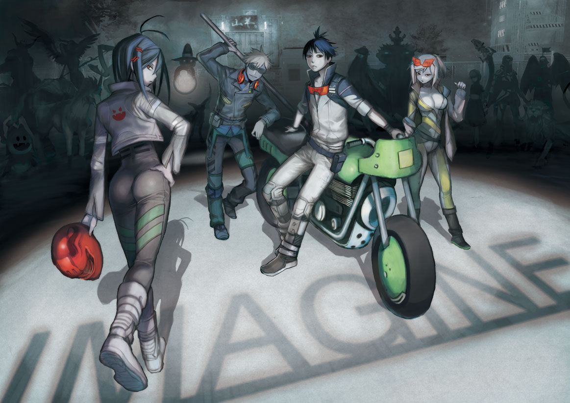 2boys2girlsassbiker clothesbikesuitbodysuitbootsbousouzokudelinquentdemon (megami tensei)helmetimaginemotor vehiclemotorcyclemultiple boysmultiple girlssunglasses