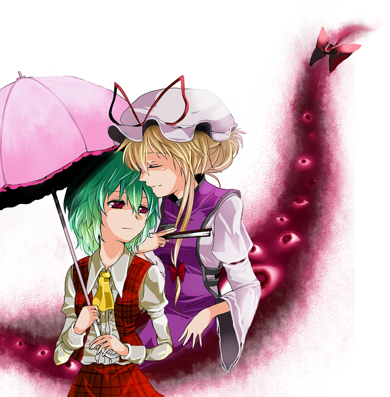 2girlsascotfemale focusfolded fanfolding fangap (touhou)green hairhand fanhatlight smilemultiple girlsparasolplaid clothesplaid skirtplaid vestred eyesshaded faceshort hairskirtskirt setumbrellavest