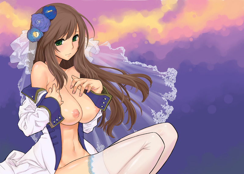00s1girlbare shouldersblushbreastsbrown hairfemale focusfingernailsflowergradient backgroundgreen eyeshair flowerhair ornamentlarge breastslong hairnail polishnipplesno brano pantiesoff shoulderopen clothesopen shirtperky breastspink nailspuffy nipplesshirtsolothighhighsundressingveilwhite thighhighs