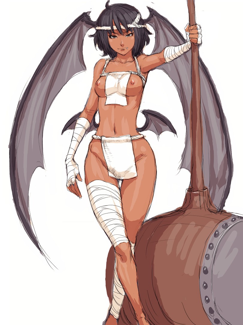 1girlbandagesbat wingsblack hairbreastsdark skindark-skinned femaledemon girlfangfemale focusfingerless glovesfundoshiglovesgrey eyeshammerhead wingshuge weaponjapanese clothesloinclothmedium breastsnipplesoversized objectshort hairsketchsoloweaponwings