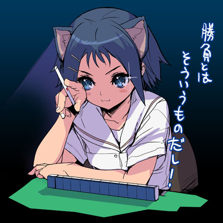 :300s1girlanimal earsarm supportblue eyesblue hairblush stickersboard gamecat earschairfemale focushair ornamenthairclipholding tenboumahjongmatching hair/eyesnail polishplaying gamesschool uniformserafukushort hairsittingsmilesolosparkletabletenbouwhite nails