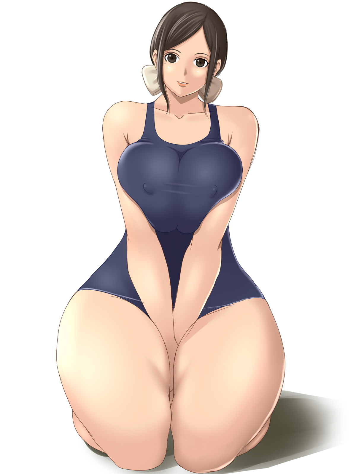 bare shouldersbowbreastsbreasts squeezed togetherbrown eyesbrown haircovered erect nipplescurvyhair bowhip focushuge breastskneelingmoleone-piece swimsuitschool swimsuitshort hairsimple backgroundsmilesoloswimsuitthick thighsthighswide hips