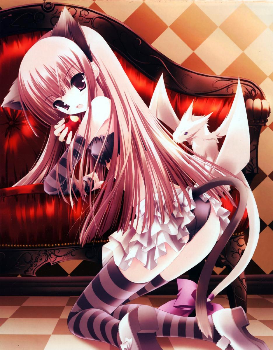 1girlanimal earsblack pantiesblushcouchdot noseelbow glovesfeet out of framefemale focusfingerless glovesfingernailsgloveskneelinglayered skirtlong hairlooking at viewerlooking backon floorpantiespink eyespink hairshoesskirtsolostriped clothesstriped glovesstriped thighhighstailthighhighsunderwearwhite shoeswhite skirt