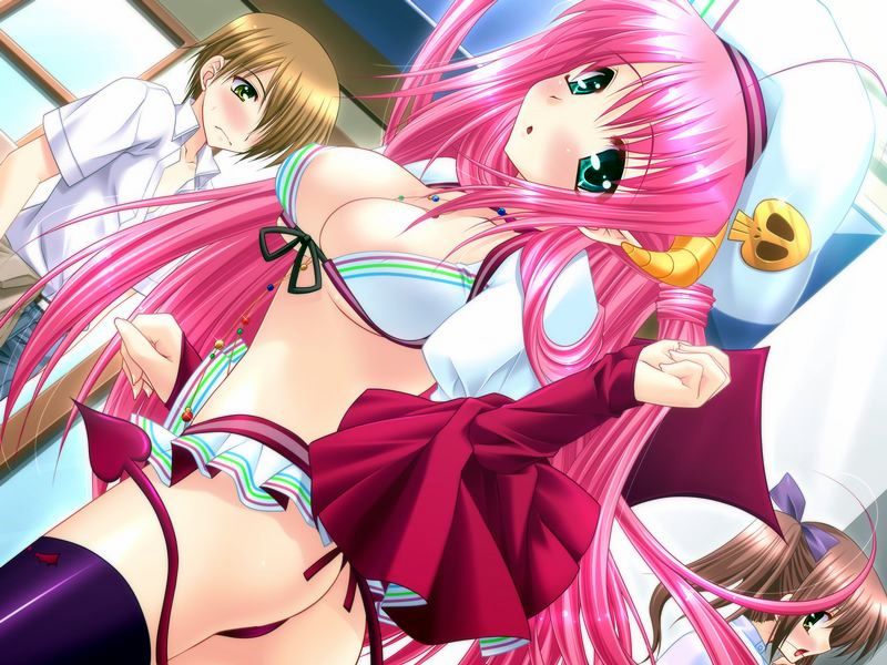 1boy2girlsassbeadsbikiniblushbowbreastsbrown haircleavagedemon girldemon tailgreen eyeshathornshuge breastsindoorsjewelrylarge breastslong hairminiskirtmultiple girlsnecklaceopen clothesopen shirtpink hairponytailribbonshirtshort hairskirtswimsuittailvery long hairwindowwings