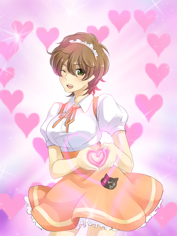 1girlbreastsfemale focusfrillsgenderswapgenderswap (mtf)green eyesheartheart handslarge breastsmaidmaid headdressmoe moe kyun!one eye closedparodysolowaitresswink