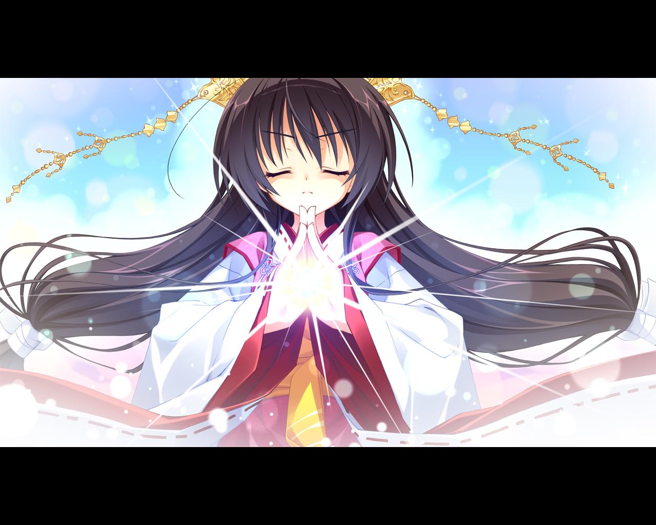 1girlbrown hairfemale focusjapanese clothesletterboxedlong hairmagicown hands togethersolotiaratwintails