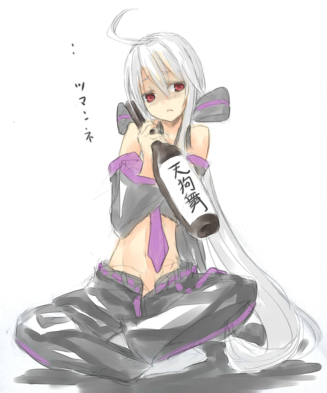 1girlahogealcoholblousedetached sleevesfemale focusgrey shirtindian stylelong hairmidriffnecktieponytailred eyesshirtsittingsketchsolo