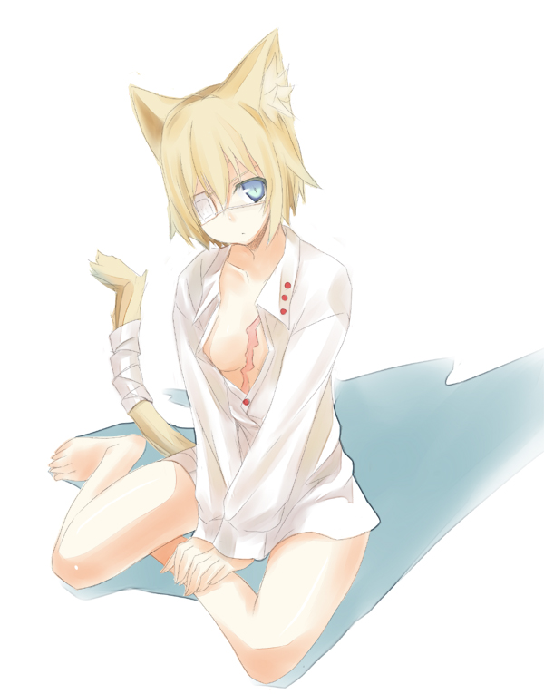 1girlanimal earsbandage over one eyebandagesbarefootblonde hairblue eyescat earscat taileyepatchfemale focusopen clothesopen shirtscarshirtshort hairsittingsolotailv armswhite shirtyokozuwari