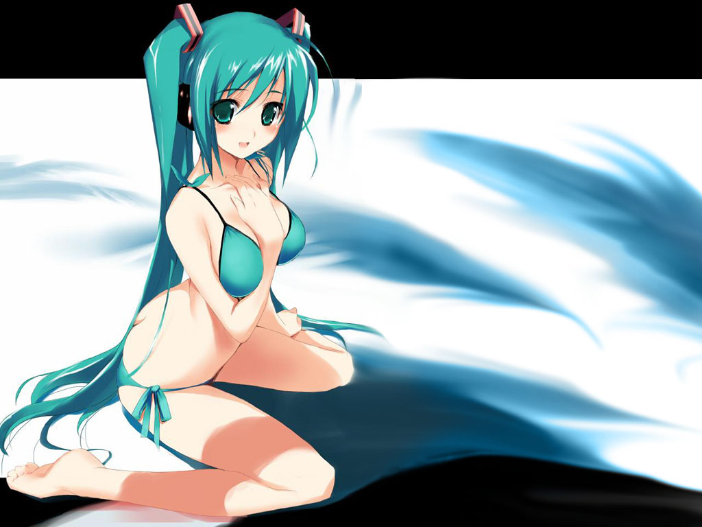 1girlaqua bikiniaqua eyesaqua hairbarefootbikiniblushfemale focuskneelinglong hairopen mouthside-tie bikini bottomsoloswimsuittwintails