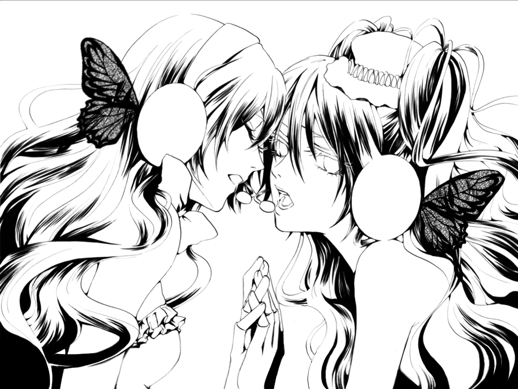 butterfly wingsgreyscalehatheadphonesheadsetinsect wingslineartlong hairmonochromeopen mouthtwintailswingsyuri
