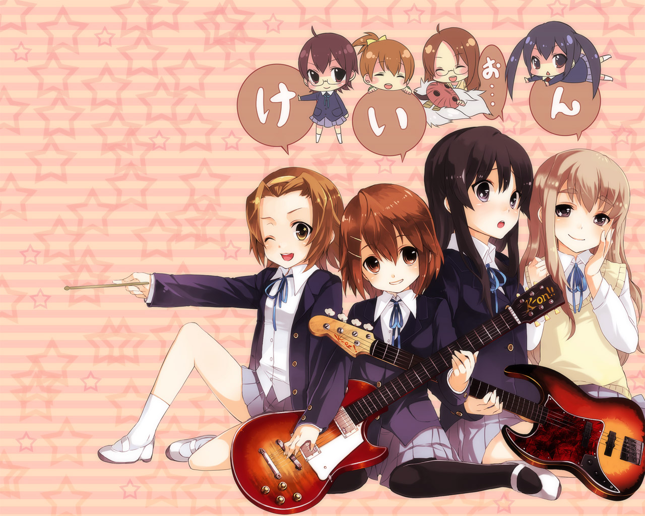 00s4girls6+girlsbass guitarblonde hairblushbrown hairchibidresselectric guitareveryonegibson les paulguitarhairbandhappyho-kago tea timeinstrumentkneelinglong hairmultiple girlsone eye closedpantyhoseschool uniformshoesshort hairsittingskirtsocksuwabakiwink
