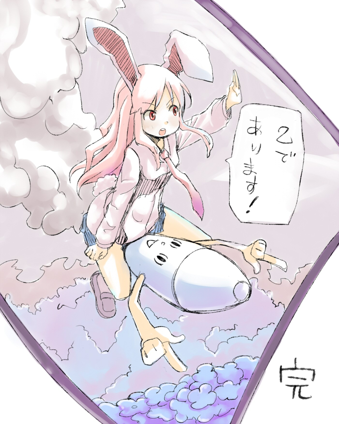 1girlanimal earsfemale focusflyingfull bodylong hairmissilenecktieoutdoorspink hairplantrabbit earssittingskysolo