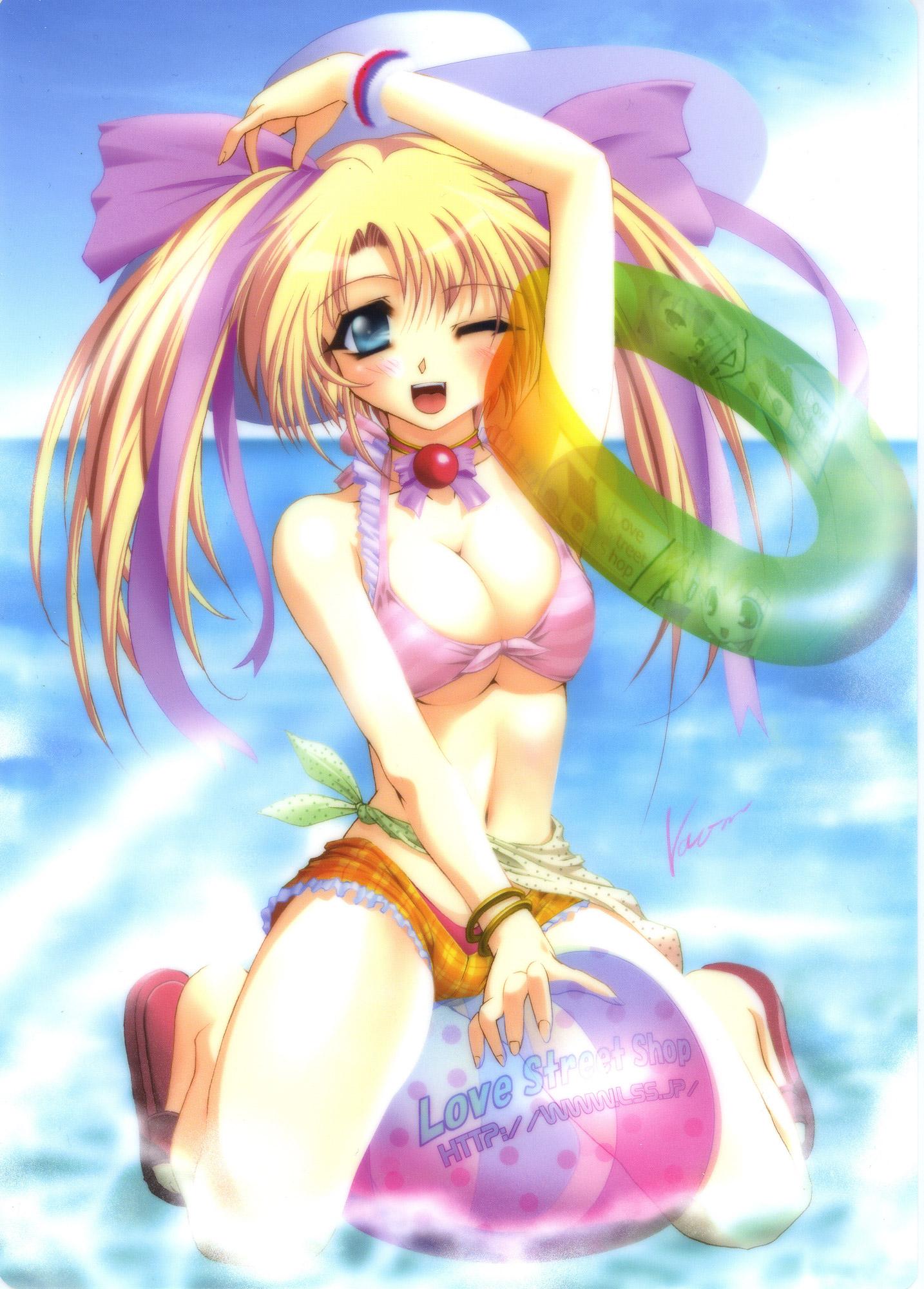 1girlballbeachballbikiniblonde hairblue eyesblushbreastscleavagedayfemale focushair ribboninnertubelarge breastslong hairlooking at viewerone eye closedribbonsolostriped bikinistriped clothesswim ringswimsuittwintailsunderboobwink