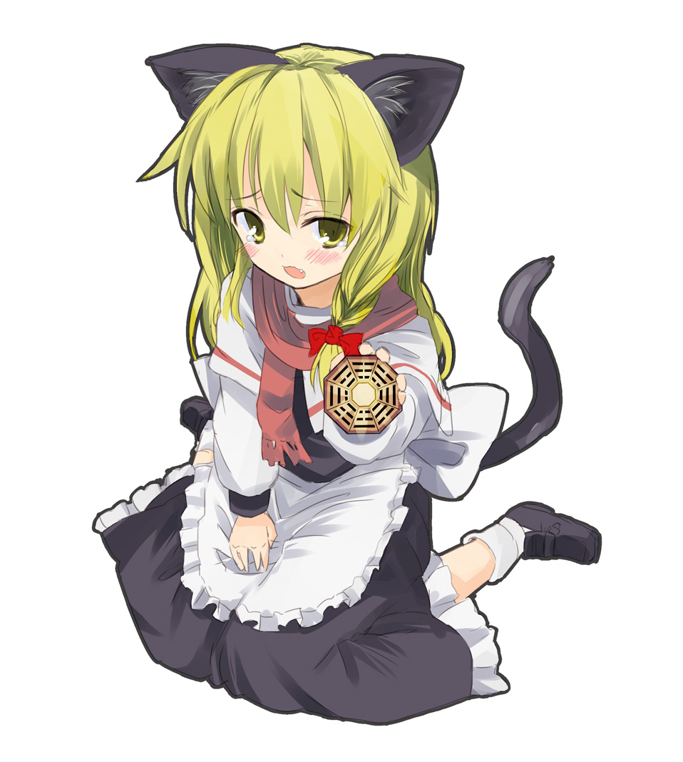 1girlanimal earsblonde hairblushbraidcat earscat girlcat tailfangfemale focusfull bodymini-hakkeroshort hairsimple backgroundsolotailtearsyellow eyes
