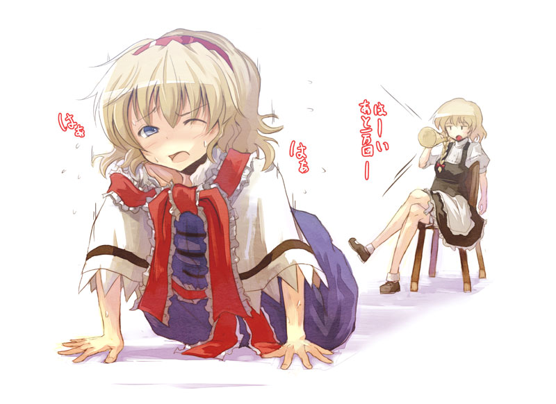 2girlsblonde hairblue eyesbraidcrossed legsexercisingexhaustedfemale focushairbandmultiple girlsone eye closedpush-upsshort hairsittingsweattrainingtremblingwink