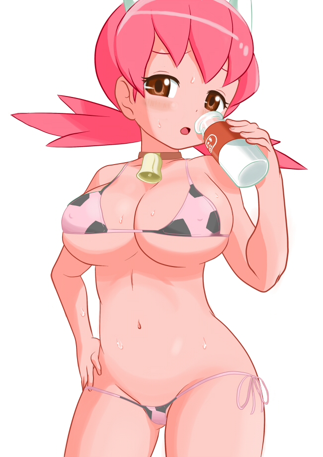 1girlbellbikiniblushbreastsbrown eyescollarfemale focusgroingym leaderhand on own hiplarge breastslooking at viewerlowleglowleg bikinimilknavelneck bellopen mouthpink hairsolostring bikinisweatswimsuitthighsunderboobwhite backgroundwide hips