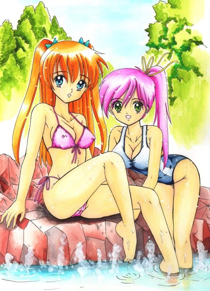 2girlsbarefootbikiniblue eyesbreastscleavagecovered erect nippleslarge breastsleaning forwardlong hairmultiple girlsone-piece swimsuitonsenorange hairpink hairponytailrocksteamswimsuittwintails
