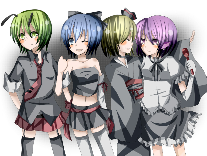 4girlsalternate costumeanimal earsantennaebare shouldersblonde hairblue hairblushbowcontemporaryearringselbow glovesglovesgreen eyesgreen hairhair bowhair ribbonjapanese clothesjewelrykimonomicrophonemultiple girlsnavelnecktieone eye closedpink eyespink hairred eyesribbonshort hairskirtsmileteam 9 (touhou)thighhighswink