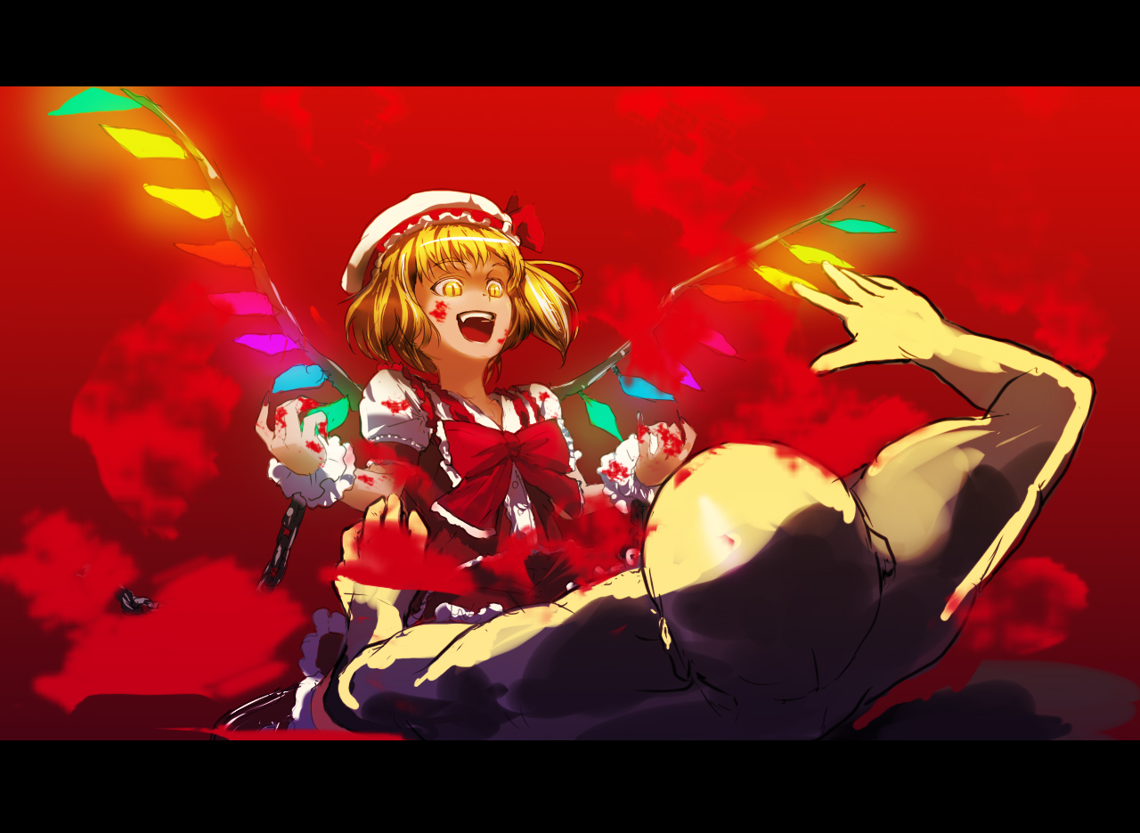 1girlbloodblood on clothesblood on faceblood on handscrazy eyesfemale focusglowinghatletterboxedmob capred backgroundsolovampire
