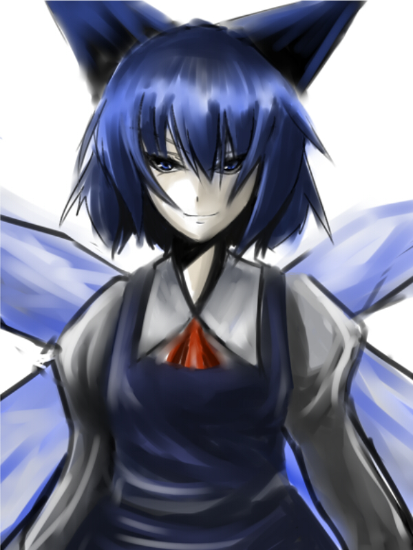 1girlblue eyesblue hairbowfemale focushair bowmatching hair/eyesshort hairsmirksolotsurimeupper bodywhite backgroundwings
