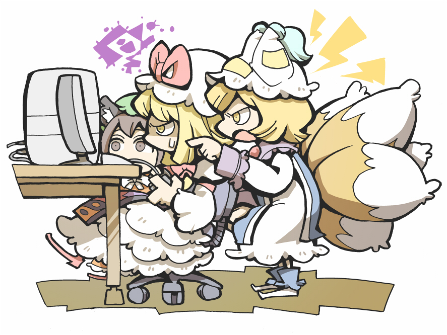 3girlsanimal earsanimal hatblonde hairbowbrown eyesbrown haircat earscat girlchairchibicomputercomputer keyboardfemale focushair bowhathat ribbonlong sleevesmob capmultiple girlsmultiple tailsoffice chairplaying gamesribbonshoesshort hairswivel chairtailtasselvideo gamewhite backgroundyellow eyes