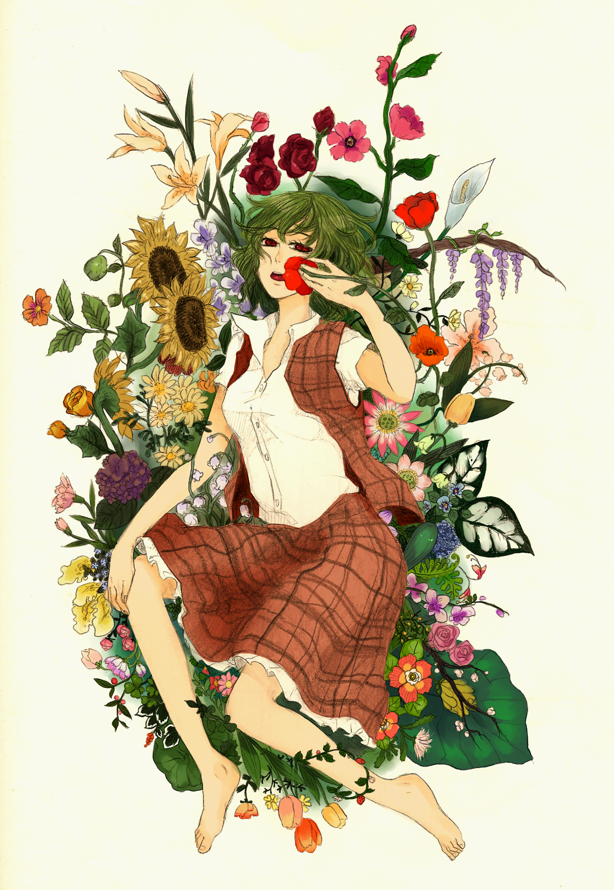 1girlbarefootfeetfemale focusflowergreen hairlily of the valleyplaid clothesplaid skirtplaid vestred eyesred flowerred roseroseshort hairskirtskirt setsolovest