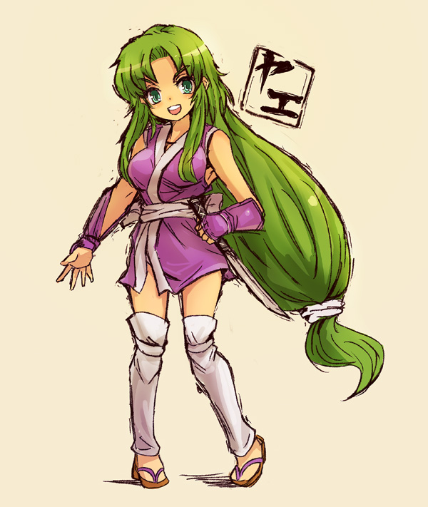 1girlblue eyesfingerless glovesglovesgreen hairjapanese clothesknifelong hairninjareverse gripvambraces