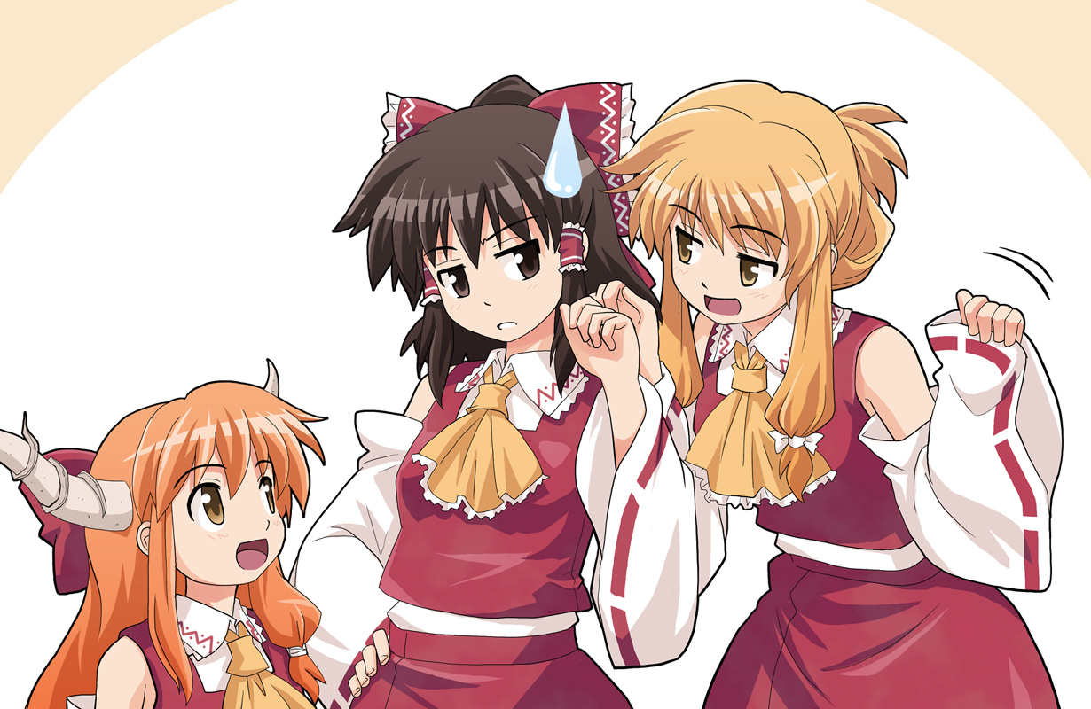 3girlsblack hairblonde hairblushbowbrown eyesbrown haircosplaydetached sleevesfemale focushair bowhakurei reimu (cosplay)hand on own hiphip focushornsjapanese clothesmikomultiple girlsopen mouthorange hairsimple backgroundsmilesweatdropyellow eyes