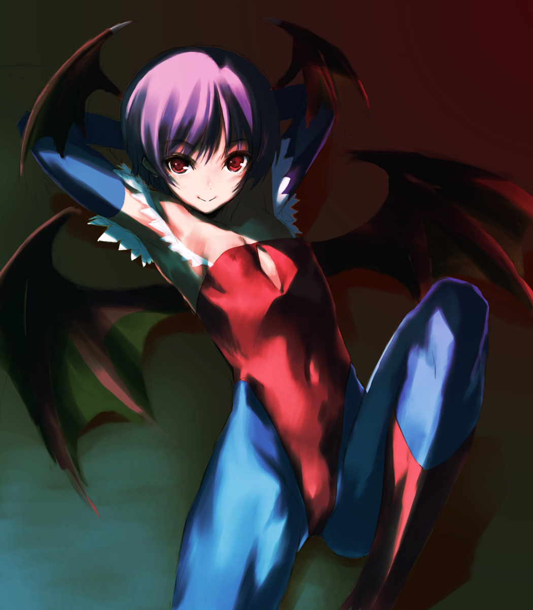 1girlbat wingsblue glovescollarbonedemon girlelbow glovesfemale focusflat chestgloveshead wingsleotardlooking at viewerpantyhosepurple hairred eyesred leotardshort hairsmilesolowings