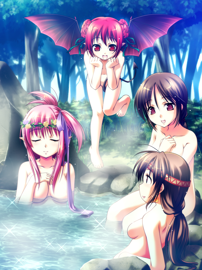4girlsbarefootbat wingsbathingbreastsbrown haircopuredemon girllakemedium breastsmultiple girlsnakiraronsenpink hairpointy earsponytailred eyessmall breastswaterwings
