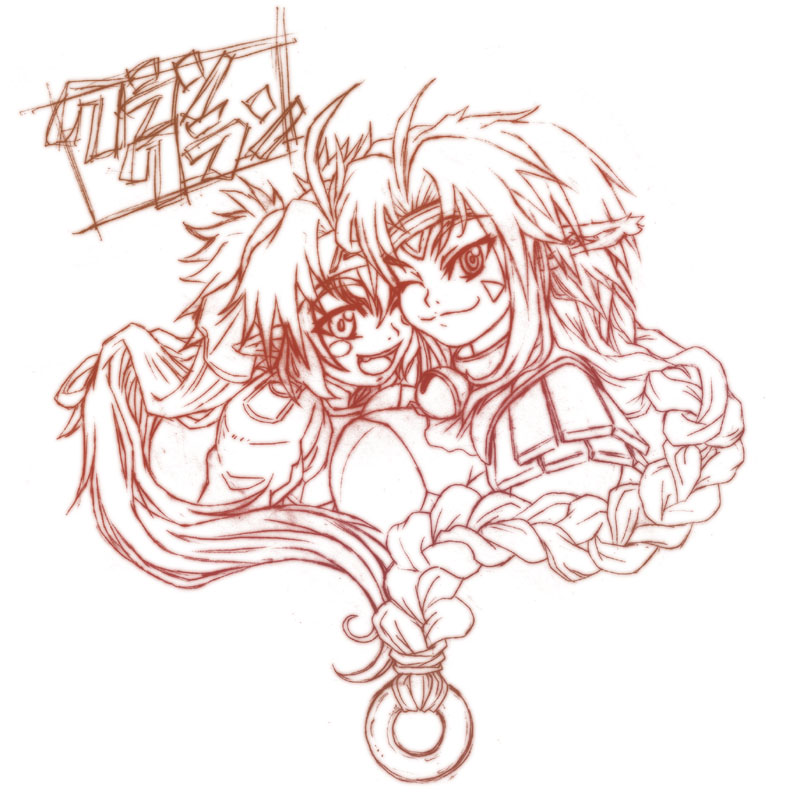 00s1990s (style)2girlsahogeanimal earsbellblush stickersbraidbreastscat earscircletcleavagecollarcrossoverfacial markhair ornamentjingle belllarge breastslong hairmonochromemultiple girlsname connectionneck bellone eye closedopen mouthpointy earsred themesingle braidsketchsmilewink