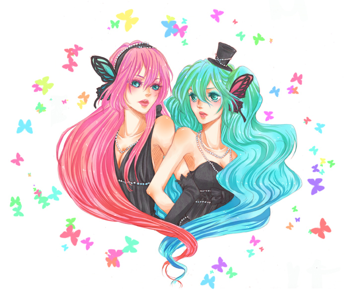 2girlsaqua eyesaqua hairbugbutterflybutterfly wingsdresselbow glovesgloveshatheadphonesinsectinsect wingsmini hatmini top hatmultiple girlspink hairtop hatwingsyuri