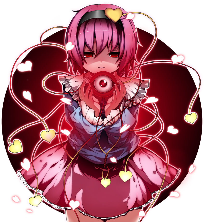 1girlfemale focushairbandheartlight smilelooking at viewerpink hairpurple hairred eyesshort hairsolothird eyewire