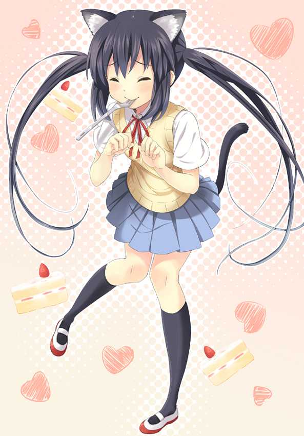 00s1girlanimal earsblack hairblushcakecat earscat tailclosed eyesfemale focusfoodforkheartlong hairpastryschool uniformshoesskirtsolosweater vesttailtwintailsuwabaki