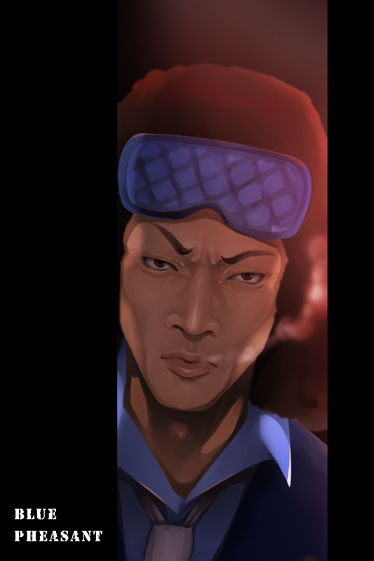 1boyafroblack hairblindfoldblue shirtformal clothesmale focusnecktierealisticshirtsleep masksolo