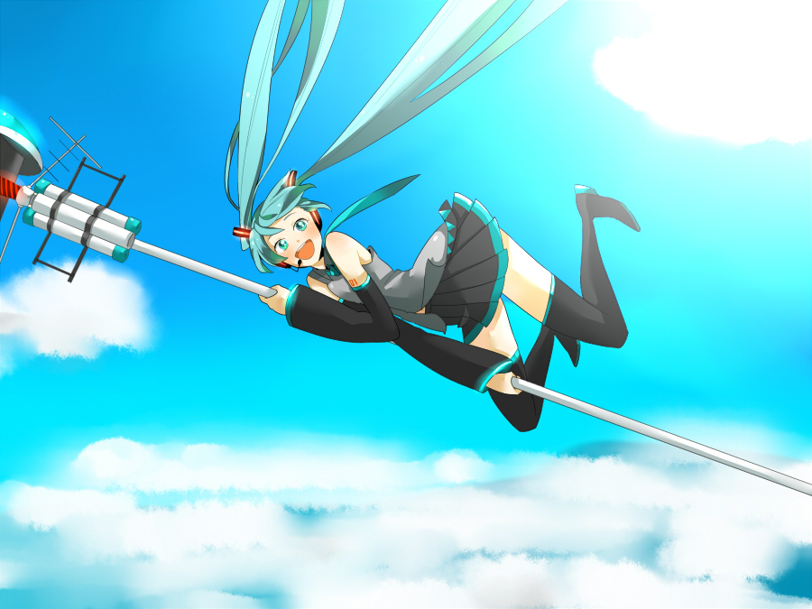 blue eyesblue hairblushclouddaydetached sleevesfallinghappylong hairskirtskysolothighhighstwintailszettai ryouiki