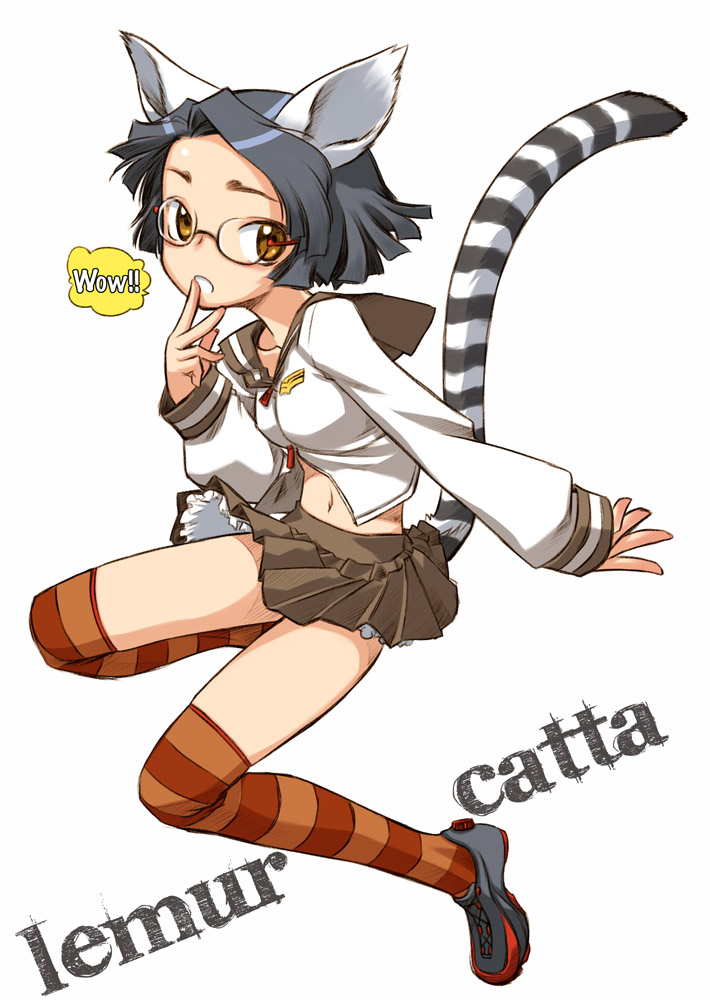 1girlanimal earsblack hairbrown eyesbrown hairfemale focusglasseslemurlemur earslemur tailmidriffminiskirtpersonificationrimless eyewearschool uniformserafukushoesshort hairskirtsneakerssockssolostriped clothesstriped socksstriped thighhighstailthighhighs