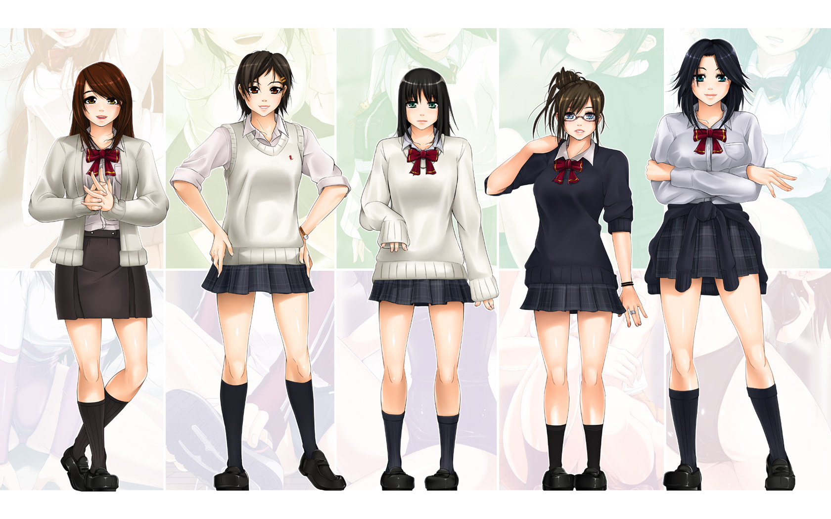5girlsblack hairblue eyesblushbreastsbrown eyesbrown haircrossed armsglassesgreen eyeshair ornamenthaircliphappylarge breastslegslong hairmultiple girlsschool uniformshiny skinshort hairskirtsleeves pushed upsleeves rolled upsmilesockssweaterthighs
