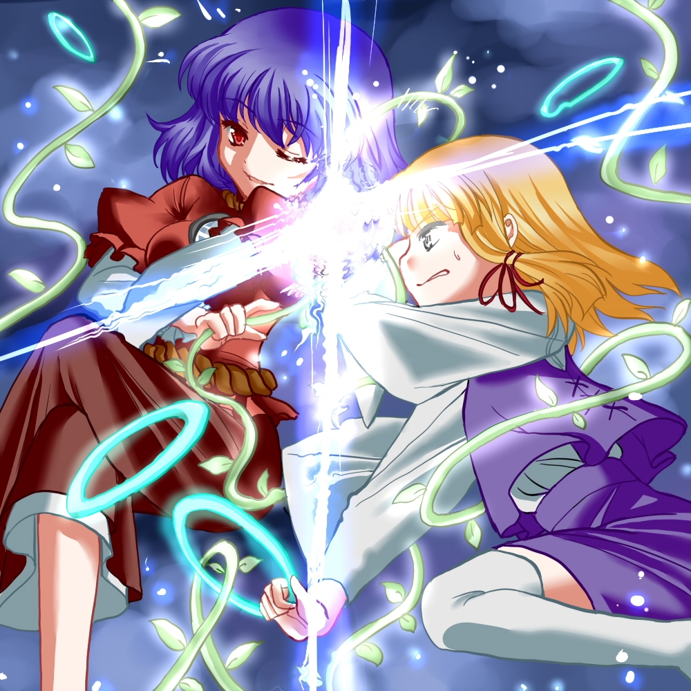 2girlsbattleblonde hairblue hairchakramfemale focusjewelryleafmoriya's iron ringsmultiple girlsone eye closedplantred eyesringropeshort hairthighhighsvinesweaponwink
