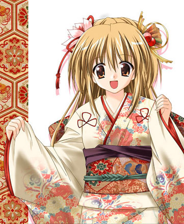 :d1girlblonde hairdot nosefemale focusfloral printfloral print kimonojapanese clotheskimonoopen mouthprint kimonosmilesoloyellow eyes