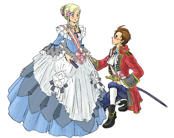 00s1boy1girlahogeascotblonde hairblue eyesblushbrown haircoatcoupledressflowerfrillsgathersgownhair bunhair flowerhair ornamenthand fanheteroholding handsjewelrykneelingnecklacerapiersheathsingle hair bunswordtrench coatweapon