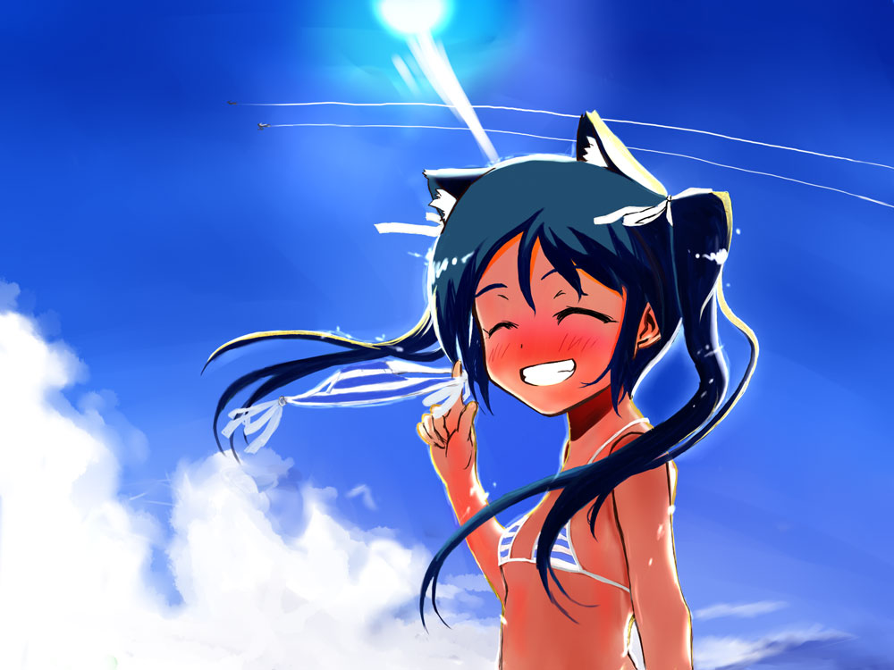 00s1girlanimal earsbikiniblack hairblushcat earsclosed eyesclouddayfangfemale focusflat chestgrinhappylong hairpantiesskysmilesolostriped bikinistriped clothesstriped pantiesswimsuittwintailsunderwear