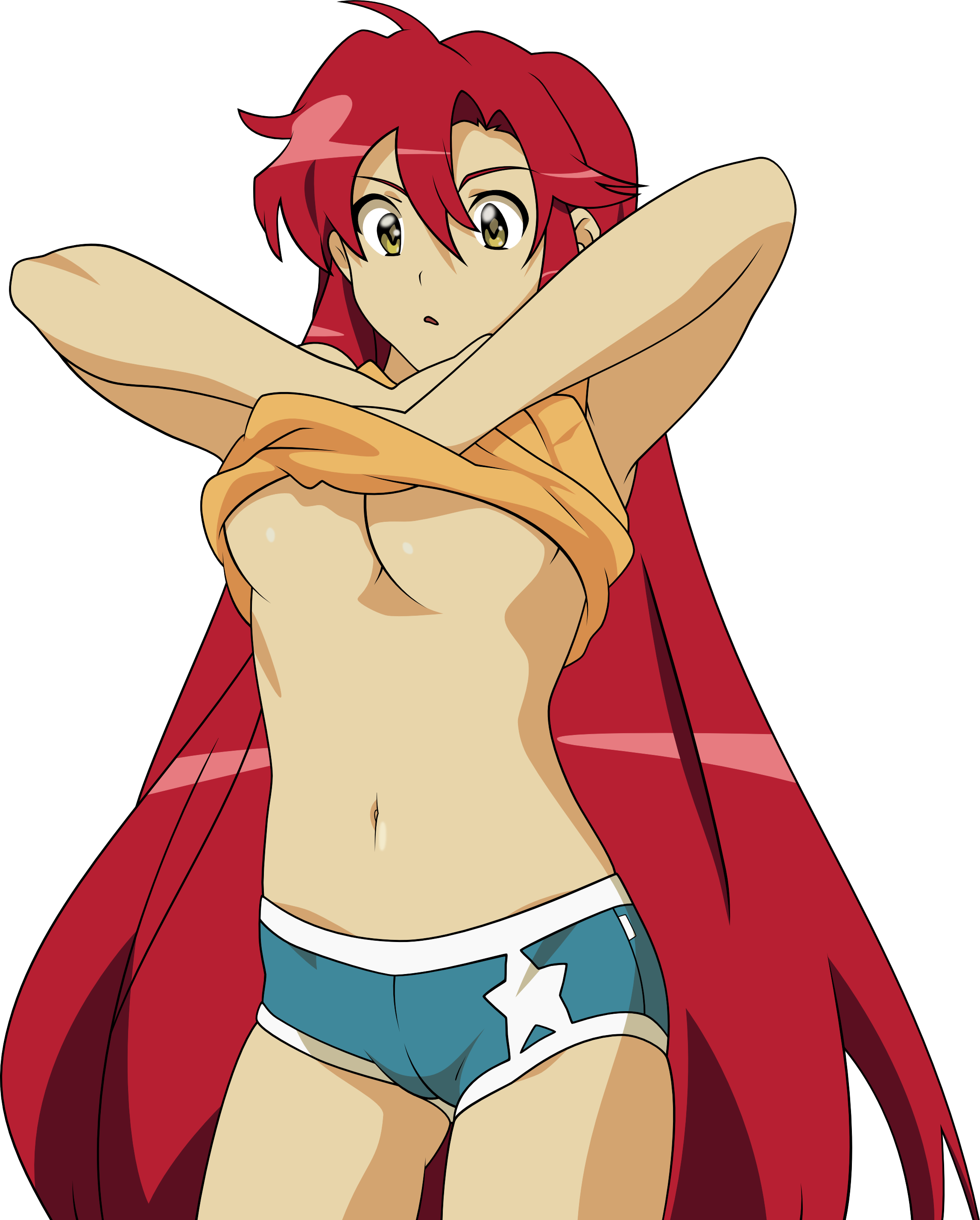 toshihiro, hong meiling, embodiment of scarlet devil, touhou, lowres, 1girl, barefoot, beret, blush, braid, breasts, cleavage, embarrassed, female focus, hat, kneeling, long hair, midriff, navel, red hair, skirt, skirt tug, sleeveless, solo, star (symbol), twin braids, vest