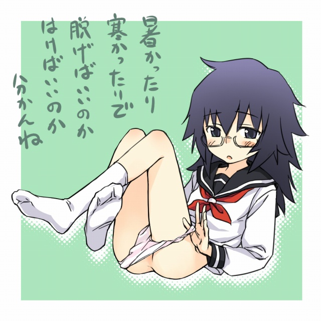 1girlassblack eyesblack hairblushfeetfemale focuslong hairpantiespanty pullschool uniformsockssolounderwearundressingwhite panties